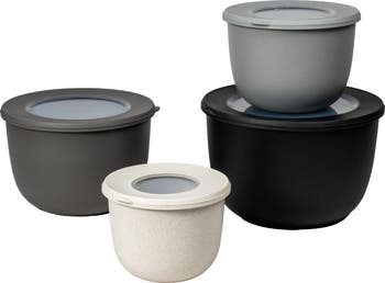 A set of stackable mixing bowls that are perfect for leftovers or traveling are made from durable, dishwasher-safe melamine and topped with secure lids.