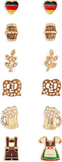 Put whimsical finishing touch on any ensemble with this Oktoberfest-inspired set of assorted stud earrings detailed with pretzels, lederhosen and more.