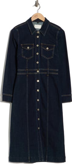 Stretch-enhanced denim clings to your curves when you don a sophisticated shirtdress fronted by gleaming buttons and detailed with high-contrast stitches.