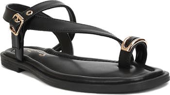 This flat sandal features a stylish cross‑strap design with an adjustable ankle buckle strap closure for a secure and comfortable fit.