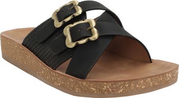 Elevate your warm-weather ensembles with this platform sandal featuring faux-leather crisscrossed straps.