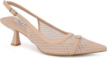 A mesh upper adds a sultry finishing touch to a slingback pump set on a curvaceous heel and framed by a pointy toe.