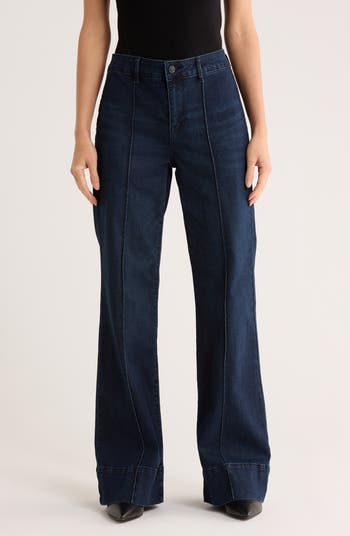 Sleek pintucks create an elongated look in these trouser-inspired jeans made with a high waist, wide legs and comfortable stretch denim.
