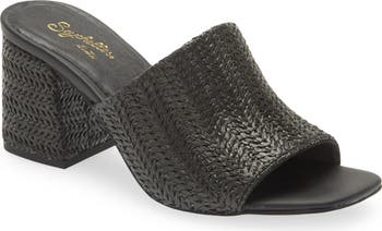 Elevate your look in this open-toe raffia sandal set on an inverted stack heel and cushioned footbed.