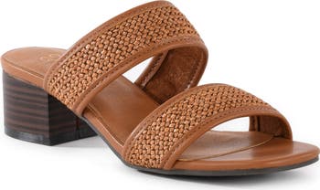 Wide woven straps secure your foot in a summery slide sandal set on a low stacked heel that's easy to walk on.