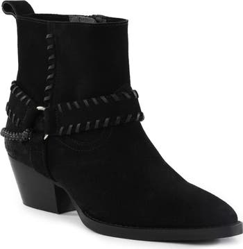 Tonal whipstitching and harness hardware amplify the Western appeal of a block-heel bootie shaped from smooth suede.
