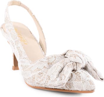 A voluminous top bow and lace upper define a slingback sandal set on a modest heel for a hint of height.