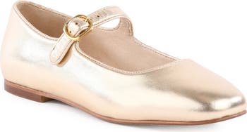 A minimalist profile and leather upper define a mary-jane flat grounded on a flexible sole for comfort.