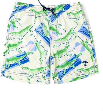 Zizag stitching prevents bunching so they can comfortably play in the sun, sand and surf in these printed swim trunks made with built-in sun protection.