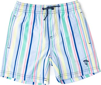Zizag stitching prevents bunching so they can comfortably play in the sun, sand and surf in these printed swim trunks made with built-in sun protection.