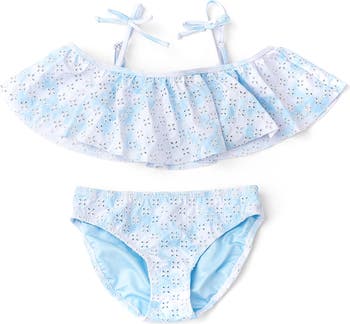 Eyelets and ruffles add to the frill of this kid-size two-piece swimsuit outfitted with built-in sun protection.