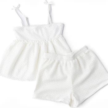 A crocheted design elevates the beach‑ready look of this fun two‑piece swimsuit featuring built‑in sun protection.