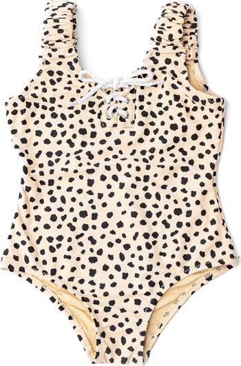A laced-up front and dalmatian leopard spots enhance the playful styling of this one-piece swimsuit cut from stretchy UPF-protective fabric.