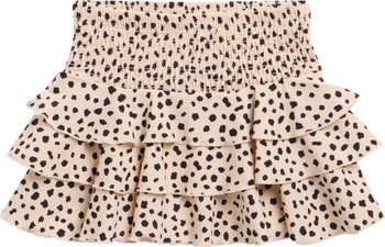 Dalmatian leopard and flowy tiered ruffles bring a playful touch to this cute, sun-protective cover-up skirt finished with a smocked waist.