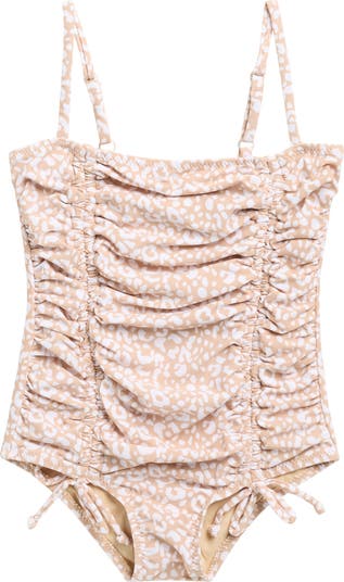 Front ruching and leopard spots enhance the playful styling of this one-piece swimsuit cut from stretchy UPF-protective fabric.