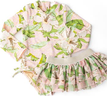 Tropical flowers pattern a beach-ready one-piece rashguard swimsuit paired with a tiered-ruffle skirt for a touch of glamour.
