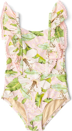 Fanciful frills cascade down the sides of this kid-approved one-piece swimsuit cut from stretchy UPF-protected fabric.