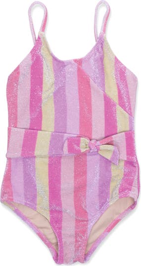 Your sun-ready cutie will love splashing and playing in this faux wrap one-piece swimsuit featuring a shimmery pastel stripe design.