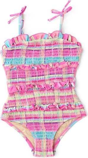 A smocked design and bow-adorned straps bring playful energy to this plaid one-piece swimsuit cut from stretchy fabric made with UPF 50+ sun protection.