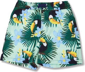 Zizag stitching prevents bunching so they can comfortably play in the sun, sand and surf in these printed swim trunks made with built-in sun protection.