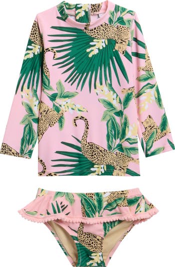 Ferocious leopards and tropical fronds pattern this two-piece swimsuit with built-in sun protection that keeps your little one splashing happily. It features a long-sleeve rashguard that blocks out the sun, sand and surf and pom-trimmed bottoms that have a ruffled flounce.
