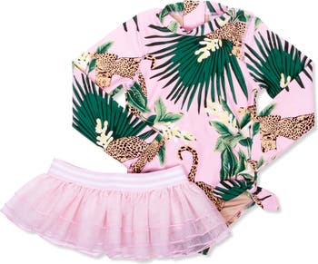Ferocious leopards and tropical fronds pattern a beach-ready one-piece rashguard swimsuit paired with a tiered tulle skirt for a touch of ballerina glamour.