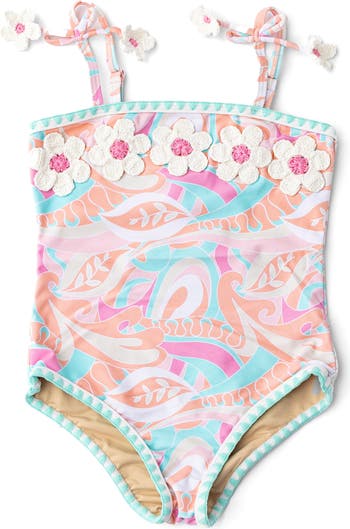 Clusters of crocheted daisies add sunny dimension to this fun two-piece swimsuit featuring built-in sun protection.