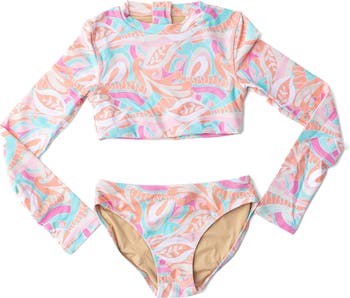 Your girl will be ready for sunny pool days in this vibrantly printed two-piece swimsuit with long sleeves for enhanced sun protection.