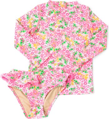 Your girl will be ready for sunny pool days in this vibrantly printed two-piece swimsuit with long-sleeves for enhanced sun protection.