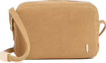 Buttery suede brings fashionable versatility to this well-organized camera bag hung from an adjustable crossbody strap.