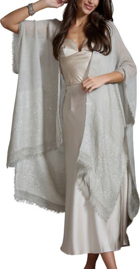 A sequin trim adds shine to a woven ruana with an asymmetric hem for freer movements.