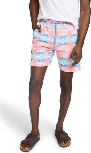 A tropical pattern details these classic swim trunks made with a stretchy blend of recycled fibers for an eco-friendly perk.