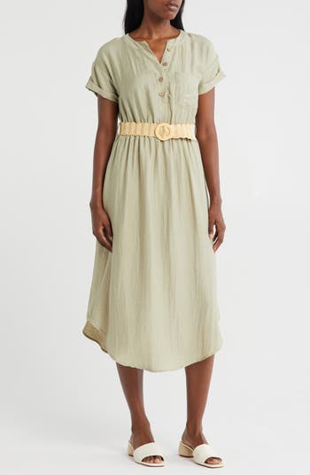 Show off utility-inspired style in this short-sleeve shirtdress fashioned with cuffed sleeves, a chest pocket and removable belt.