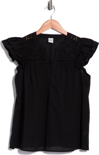 Tiered-ruffle sleeves and airy eyelet embroidery enhance the sunny-day styling of this flowy top perfect for refining your weekend ensembles.