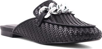 Polished chain hardware makes a statement at the vamp of an apron-toe mule finished with a chic, woven design.