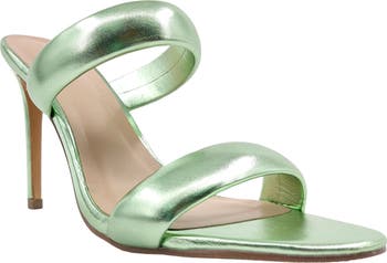 Puffy vamp straps define a playfully seductive silhouette to a spike-heel sandal covered in a metallic faux-leather fabric.