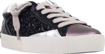 Metallic finishes and sparkling glitter give a playground-perfect finish to a sporty, low-top sneaker secured with knotted laces for easy, slip-on access.