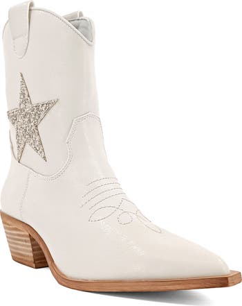 Decorative stitching and a curved topline distinguish a pull-on Western boot fashioned with a glittery star appliqué for added flair.