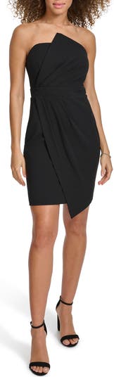 An envelope hem and asymmetric neck further the contemporary styling of this minidress cut from a stretchy scuba knit.