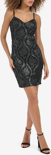 Flirty and fitted, this sweetheart-neck mini crafted from embroidered lace with faux leather details is a shortcut to a statement look.