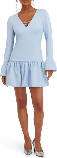 Slender chain straps glimmer from the neckline of this flare-cuff dress finished off with a ruffled hem in a mini length.