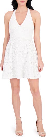Lovely floral lace romances this leggy-length dress meant to show off your shoulders and back.