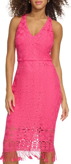 A tonal lining furthers the whimsical look of this floral-lace sheath dress styled with a slender back keyhole cutout.