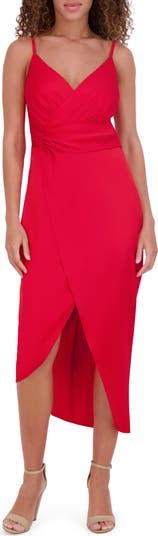 Perfect for your next date night, this form-hugging midi dress is fashioned with a high-low envelope hem for easy movement.