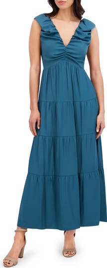 Ruched detailing creates a unique texture on the neckline and straps of a woven sundress that makes a perfect choice for sunset cocktail hour.