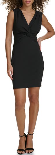 A knot at the underbust gives shape to this figure-hugging sheath dress framed with a V-neckline and sleeveless cut.