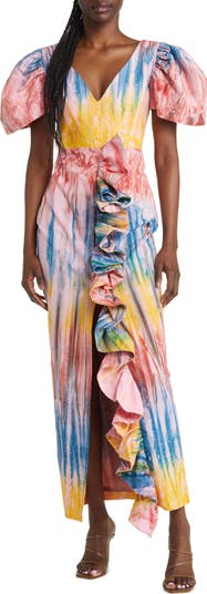 An explosion of gorgeous colors artfully adorns this ruffle-laden maxi framed by voluminous sleeves and cut from structured cotton.