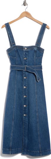 Perfect to dress up or down, this stretch-kissed denim midi is fashioned with bustier-inspired seaming and an elegantly flared silhouette.