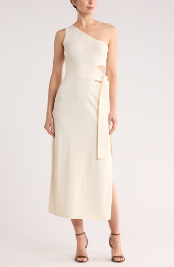 A one-shoulder silhouette lends modern style points to a party-ready dress cut from cotton and silk for an elegant look and feel.