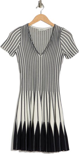 Bold stripes enhance the charm of this ribbed fit-and-flare sweater-dress knit from soft, lightweight yarns.